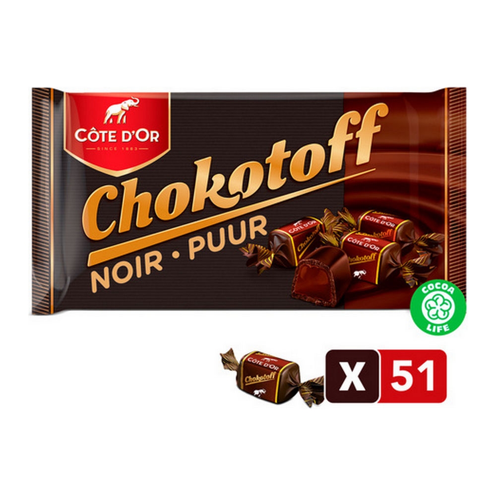 De pure chocolade van Côte d’Or Chokotoff Puur vermengt zich moeiteloos met de zachte toffee binnenin. Elk individueel verpakt snoepje van Côte d’Or biedt een moment van diepgaand genot. Deze smaakvolle combinatie verzekert een langdurige, rijke smaakbeleving, ideaal voor diegenen die van een intens chocolademoment houden. Chokotoff is een ware traktatie die de essentie van authentiek chocoladevakmanschap weerspiegelt! U kunt deze snoepjes bijvoorbeeld bij de koffie aanbieden.
